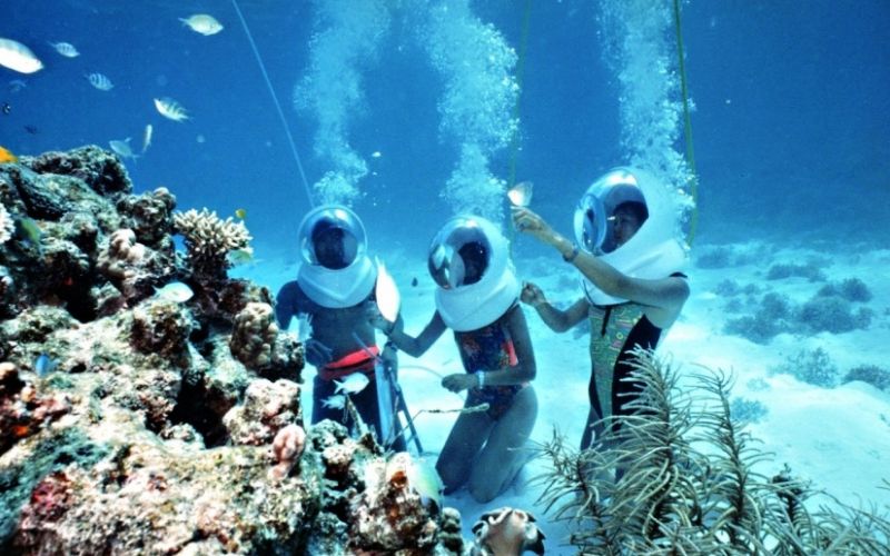 Đi bộ dưới biển: Hơi khác biệt với lặn biển, khi tham gia tour đi bộ khám phá biển, bạn sẽ được cấp một chiếc mũ oxy lớn thay vì lỉnh kỉnh các bình dưỡng khí. Điều này cũng sẽ giúp bạn dễ dàng tham quan và chiêm ngưỡng thế giới đại dương đầy màu sắc.