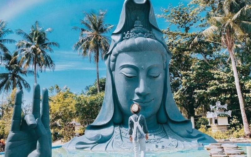 Bên trong khuôn viên 5000m rộng lớn, bạn cũng có thể gặp được rất nhiều nền cảnh đẹp để check-in: bức tượng Đức Phật khổng lồ trong hồ nước cạn, “sống ảo" trước cổng vào bằng san hô trắng, ngồi trên cầu đá qua hòn non bộ giả,...