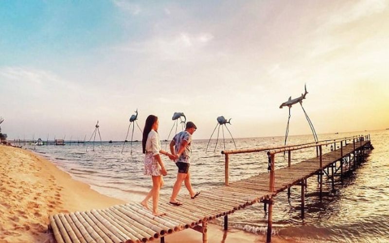 Cây cầu gỗ nối dài ra biển là điểm check-in lý tưởng của nhiều du khách khi tham quan làng chài Hàm Ninh Phú Quốc. Tại đây, bạn có thể chiêm ngưỡng vẻ đẹp của hoàng hôn và bình minh.
