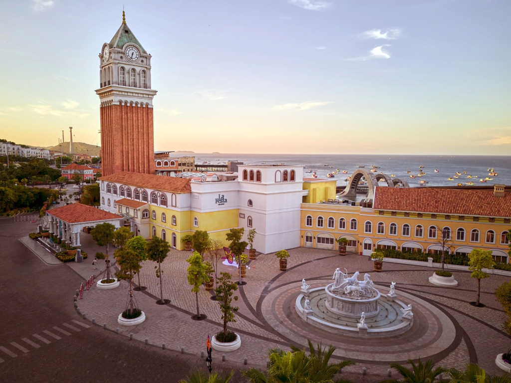 Khu quảng trường trung tâm và phố đi bộ tại Sunset Town luôn nhộn nhịp với không gian mở hướng biển, các công trình kiến trúc rực rỡ sắc màu cùng những bậc thang, mái vòm, tháp chuông mang hơi thở châu Âu. Du khách có thể thong thả dạo bộ, chụp ảnh, khám phá từng góc phố với cảm giác như đang lạc vào một thị trấn ven biển Địa Trung Hải thực thụ.