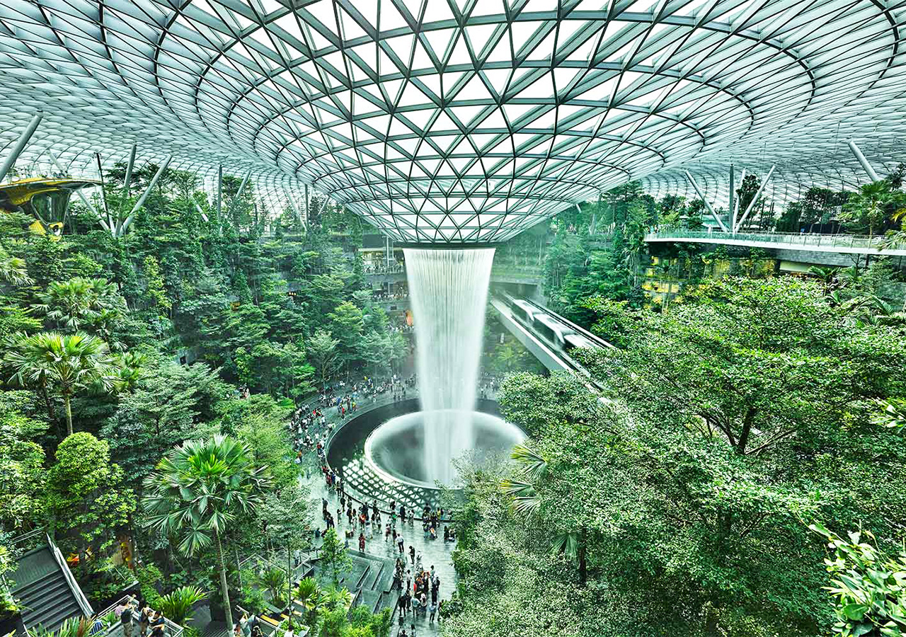 Jewel Changi kết hợp giữa thiên nhiên với sức sáng tạo của con người. Chiêm ngưỡng Rain Vortex cao 40m, thác nước trong nhà cao nhất thế giới, khám phá thung lũng rừng Shiseido xanh tươi với các loài thực vật được chăm sóc tỉ mẩn. Một điểm du lịch phải check in khi du lịch Singapore.