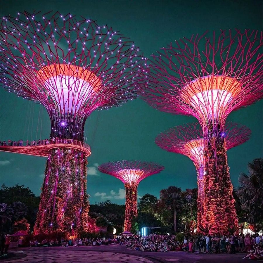 Kỳ quan Gardens by the Bay (Những khu vườn bên Vịnh) đây là khu vườn nhân tạo rộng hơn 100ha, có hơn 250.000 loài thực vật quý hiếm, với các Siêu cây khổng lồ lấy năng lượng mặt trời vào ban ngày và tỏa sáng vào ban đêm.