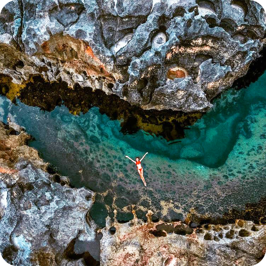 - Tiếp tục hành trình, đoàn ghé thăm Angel’s Billabong – một “hồ bơi vô cực” tự nhiên kỳ lạ nằm giữa biển trời Nusa Penida. Với làn nước trong vắt hiện rõ đáy, đặc biệt nổi bật với 4 gam màu độc đáo thay đổi theo ánh nắng mặt trời, nơi đây tựa như một kỳ quan giữa thiên nhiên.