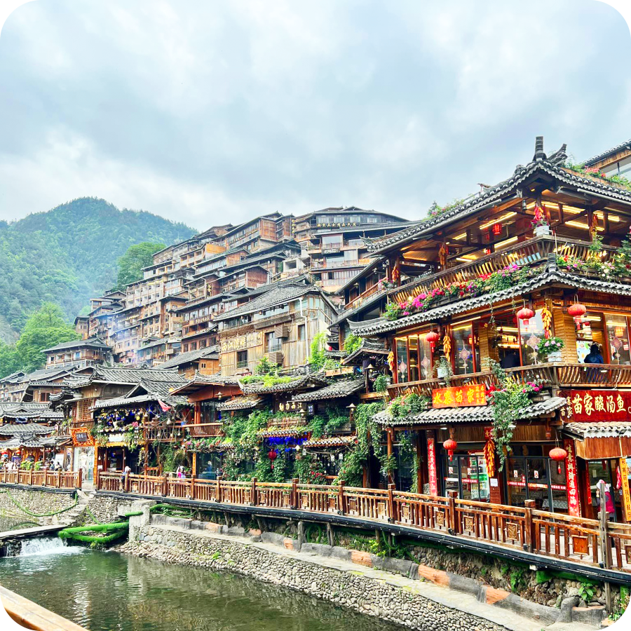Trưa: Đoàn dùng bữa trưa tại nhà hàng địa phương. Sau đó, đoàn di chuyển về Phượng Hoàng Cổ Trấn – Trấn cổ 1300 năm tuổi, là điểm check-in hàng đầu tại Châu tự trị người Miêu - Quý Châu. Nổi tiếng với những ngôi nhà cổ kính, nép mình bên dòng Đà Giang hiền dịu. Nơi đây từng đi vào phim ảnh, tiểu thuyết Chuyện Biên Thành của Thẩm Tùng Văn xoay quanh mối tình của nàng Thúy Thúy tạo nên nét đặc sắc không lẫn vào đâu của Tình Tương Tây.
